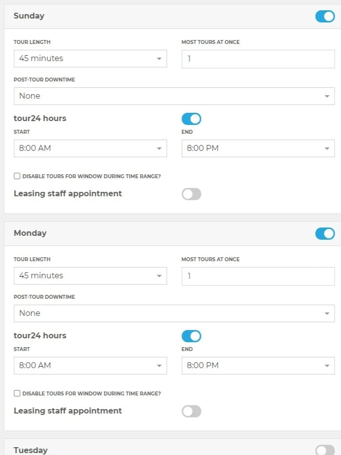 Being able to edit the tour availability times on the tour was essential for the lease up. As apartments were leased I needed to be able to quickly disconnect and edit to ensure prospects were viewing exactly what they could lease.